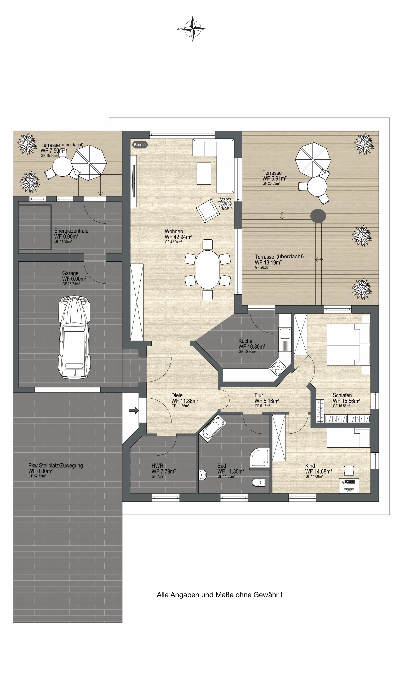 Die Räumlichkeiten des Hauses sind modern und einladend gestaltet. Die Fußbodenheizung mit Einzelraumregelung sorgt für eine angenehme Wärme im gesamten Haus. Die offene Wohnküche bietet genügend Platz für gemütliche Kochabende mit der Familie. Das Badezimmer ist mit modernen Sanitäranlagen ausgestattet und verfügt auch über eine ebenerdige Dusche. Die teilweise überdachten Terrassen laden zum Entspannen und Sonnenbaden im Freien ein.