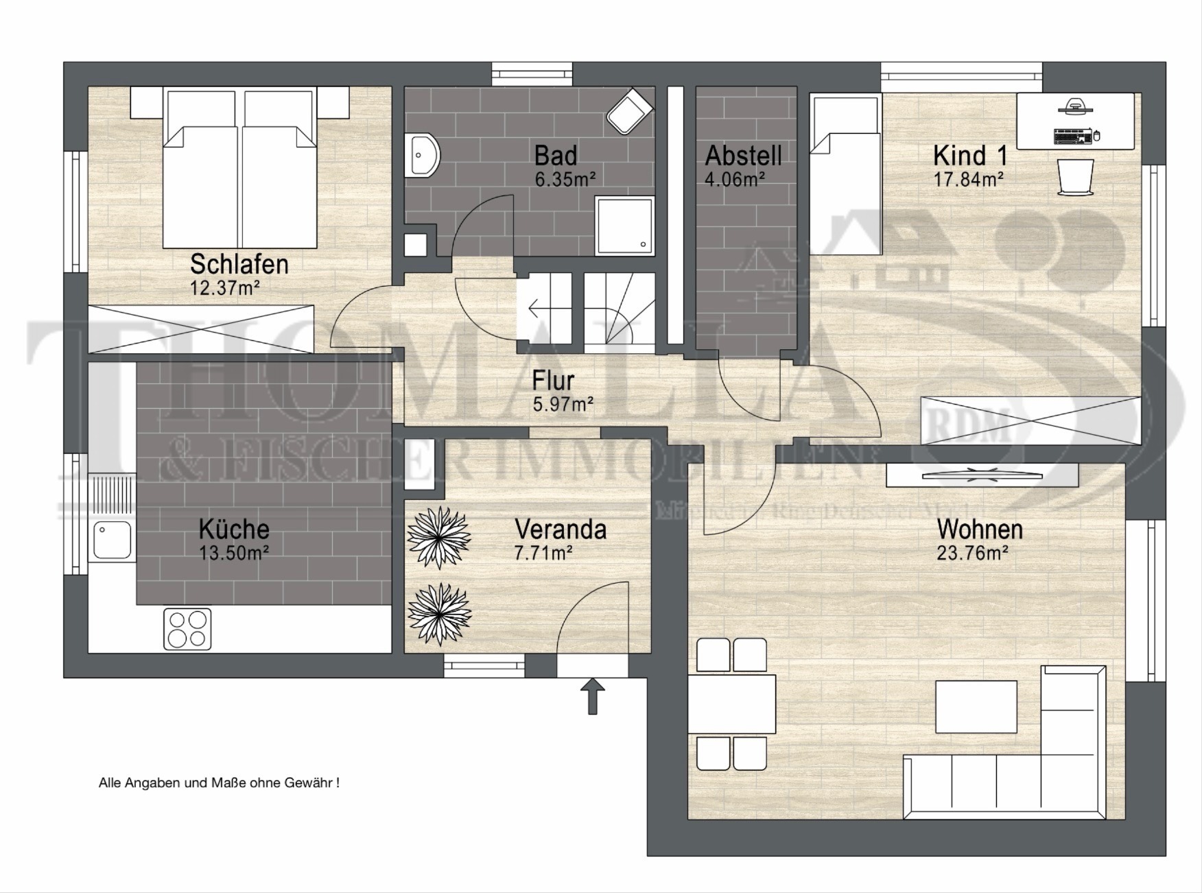 Veranda, Wohnzimmer, Kinderzimmer, Schlafzimmer, Flur (mit Zugang zum Keller), Küche, Bad/WC